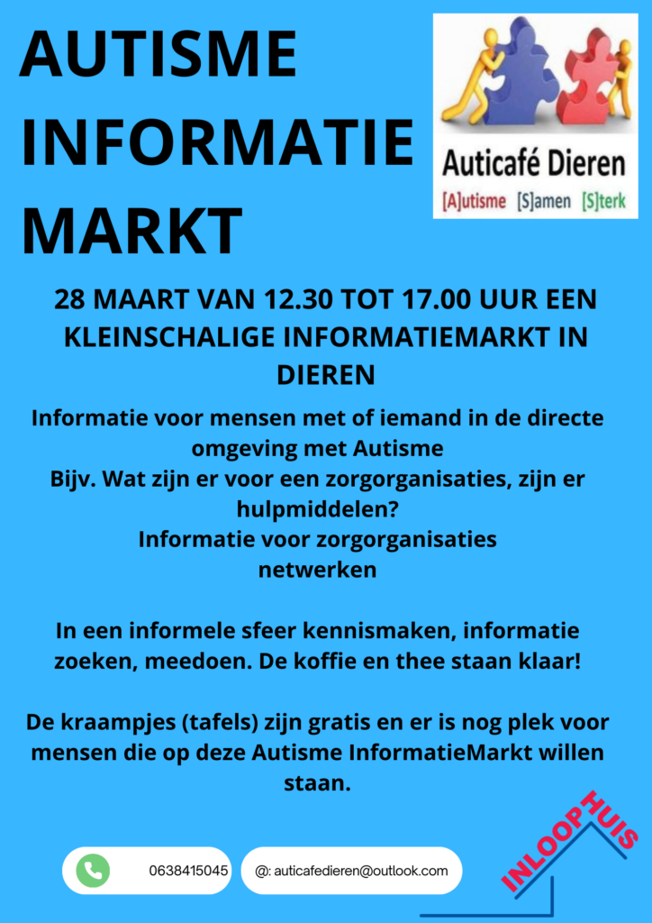 Informatie is te vinden via de Facebookpagina van Inloophuis Dieren of het Auticafe Dieren.